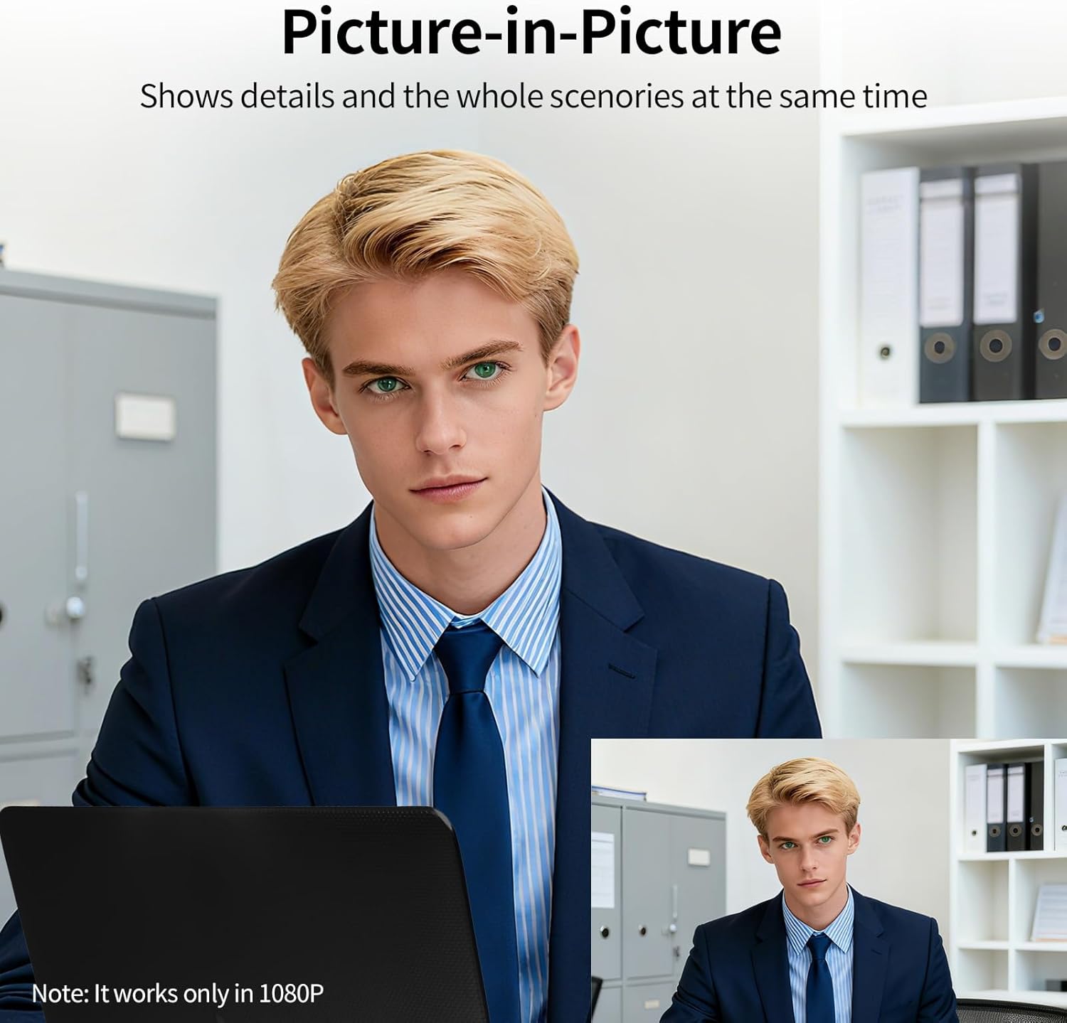 Auto framing & Picture-in-Picture: The web camera supports auto framing technology, which can automatically detect attendees within the view angle then automatically adjust the viewfinder frame so that the attendees are always displayed in the center. Long press the right button you can enter the picture-in-picture mode that shows the details and full frame at the same time. This computer webcam supports 5X digital zoom, more details for you. Please note that the zoom function is only available at 1080P resolution.