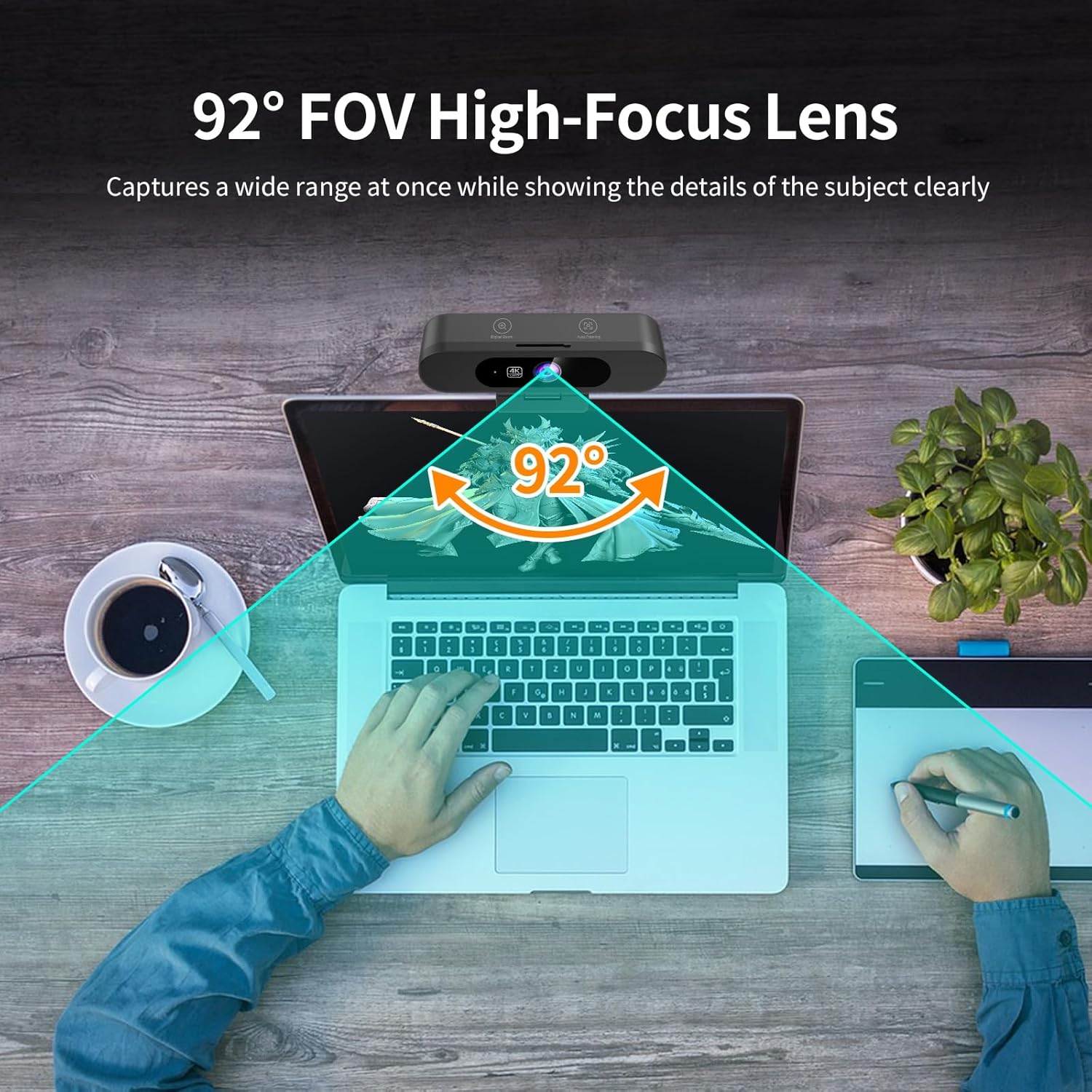 92° Wide FOV & Privacy Cover: Ultra-wide angle 92°lens captures more participants without frequent adjustments and suitable for presentations. 360° horizontal rotation, 90° downward for better view angle. This 4K webcam has a built-in sliding privacy cover that physically blocks the lens with a gentle push.