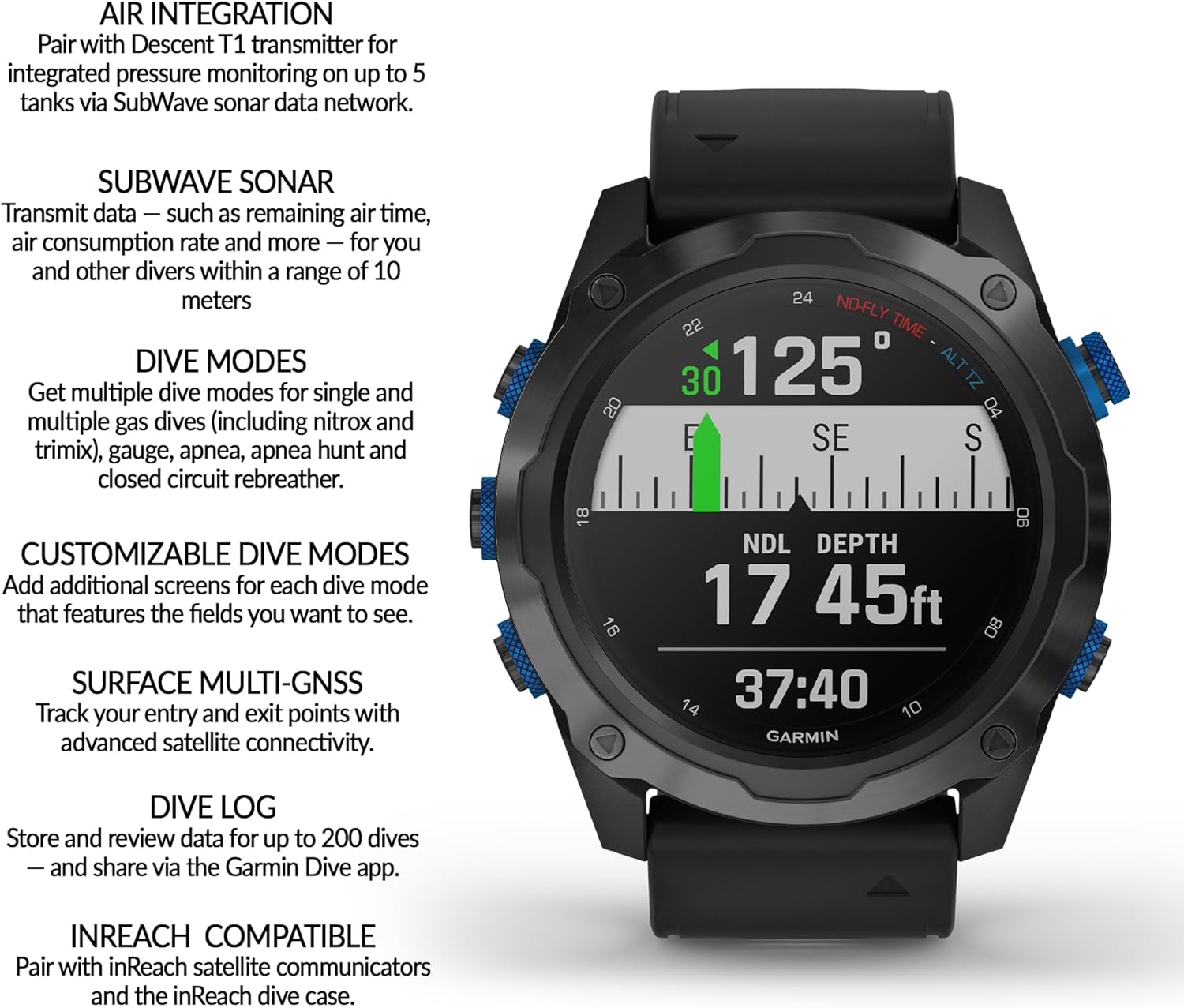 ADVANCED DIVE TECHNOLOGY: Engineered for recreational and technical divers, Garmin Descent Mk2i is a watch-style dive computer with multiple dive modes, including single and multiple gas, gauge, apnea, and CCR. Pair it with the Descent T1 transmitter to monitor tank pressure for up to five divers via SubWave sonar. Customize dive screens, log up to 200 dives, and review detailed stats in the Garmin Dive app.